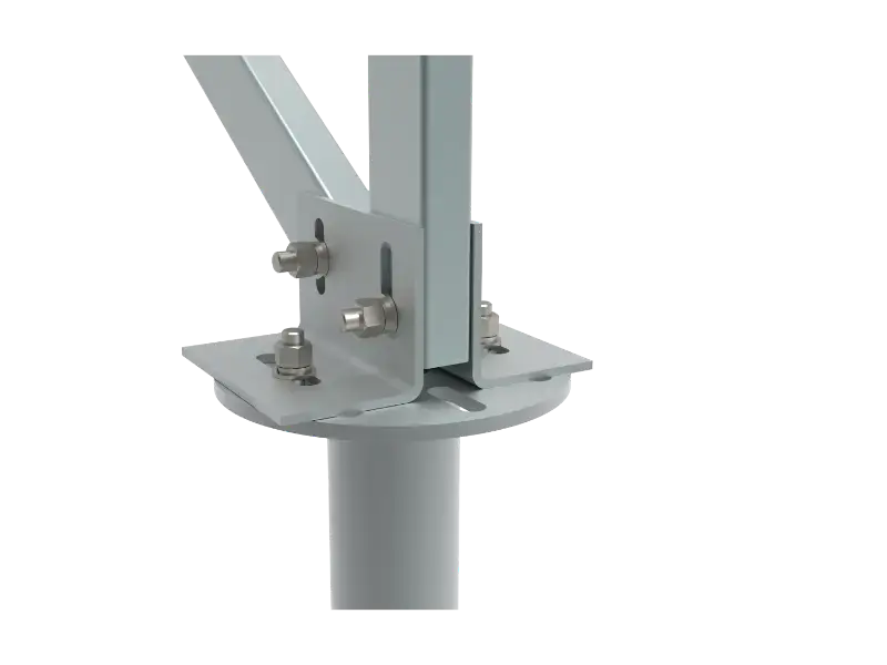 The installation process of Double Hole Solar Steel Base is straightforward. All components include two brackets and two M10*85 bolts. The only tool required is a screwdriver. To install, locate a vertical post and a diagonal brace, position them as close together as possible, then place the brackets on either side. Secure them by threading the bolts through and tightening them to complete the installation.
